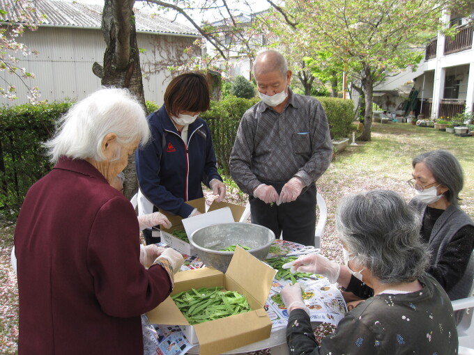 手先の器用なひとは黙々と作業中に集中されていました。桜の木の下で歌を歌ったり、楽しくあっという間にきれいにすじ取りが終わりました。