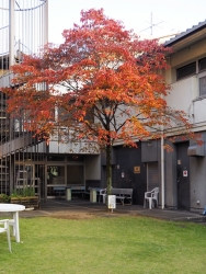 長楽荘のハナミズキの葉が色づいています。今日も夕日に照らされて美しく輝いています。