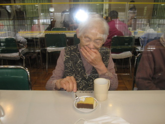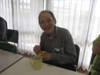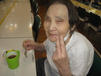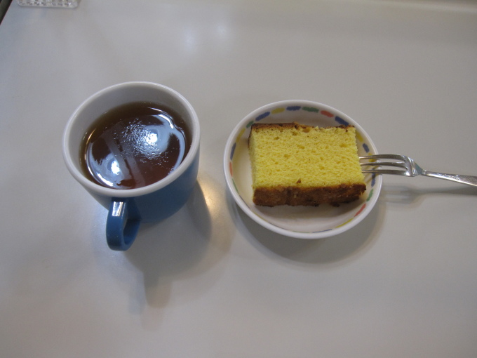 今日のおやつは、カステラとほうじ茶です。食堂の前では入居者さんと職員で楽しく会話していました。