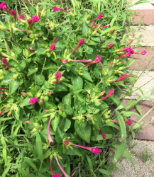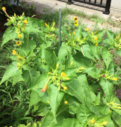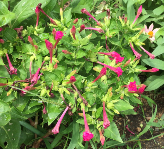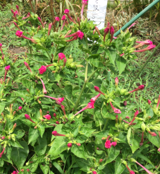 萎んだ花がらがあるのに咲いているところをあまり見たことが無い「オシロイバナ」実は夕方に咲き始め、天候にもよりますが午前中には萎んでしまう「一日花」だそうです (>_<)ただ次々に咲き続ける為10月頃まで楽しめます ヾ(≧▽≦)ノ黒い種を割ると白い粉質のものがありそれが「おしろいの粉」のようなのでこの名がつけられたようです花言葉は「臆病」「内気」「恋を疑う」