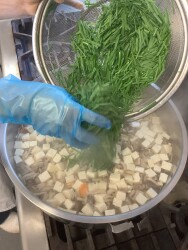 そして、「トレーに広げて写真撮影」「ご利用者が食べているところも写真撮影し、感想を聞くように」との命題を受け、まずは新鮮なうちにトレーに広げた写真を撮り、しっかり洗ってザクザク切って、翌日の朝のみそ汁に投入し、提供し、味わっていただきと、順序よく進みましたのでご紹介します。