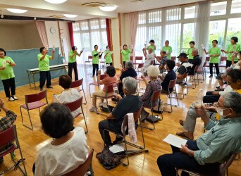 鳴り物を使用して、「おもちゃのチャチャチャ」は会場に一体感があって良かった、参加者からは「楽しかった」、「面白かった」の声が多かった。連合会の皆様から、参加者の方々向けに、ガチャと併せて巾着に小物入れとポケットティッシュのお土産をいただきました。声の通る植田会長がマイクなしで話された「この地を支えてくれた高齢者と喜んでいける活動をしていく」・・・・「ありがとうございました」