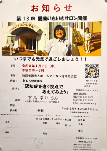 『第13回 健康いきいきサロンのお知らせ』日時:令和8年1月7日(水)午後2時~3時場所:特別養護老人ホームアミカル地域交流室内容:新しん健康体操講演:「認知症を違う視点で考えてみよう」 講師 有馬 幸江 さん (介護付有料老人ホーム 松平施設長)懇談参加料:無料いつまでも元気で過ごしましょう!!