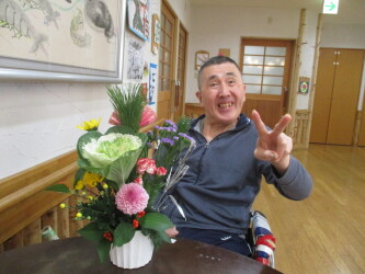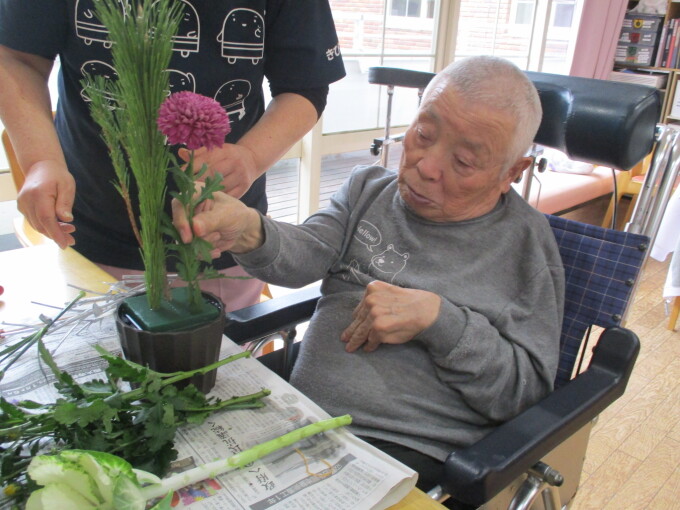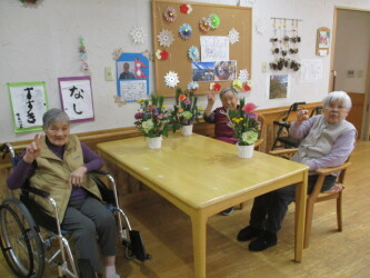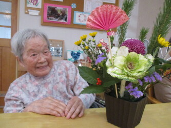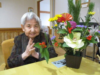 今年度も新年に向けた生け花を行いました!松、千両、菊、葉牡丹…などなどを使用し「私は池坊を習っとったんよー!」「私流でやろうかな」「あえてここは切らずに…」と、皆さまと楽しくお話しながら新年に思いを込めて素敵な生け花ができました!今回は本館の皆さまのご様子をご紹介します(^^)/