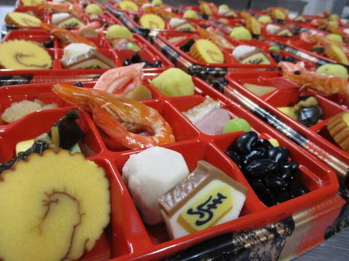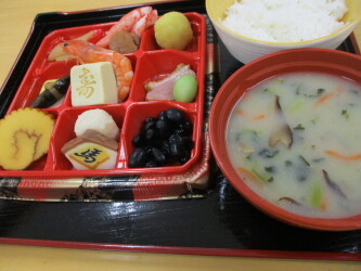 元旦は朝食に続き昼食もおせちです(^O^)昼食のメニューは!!☆ごはん☆数の子☆花三色☆六角里芋☆かに蒲鉾☆帆立の旨煮☆海老の旨煮☆黒豆の煮物☆寿高野豆腐☆絵馬蒲鉾☆若桃の甘露煮☆栗きんとん☆合鴨スモーク☆雑煮彩豊かな料理を皆さん喜んでくださいました\(^o^)/希望者のみ雑煮にお餅も入ってボリューム満点です♪