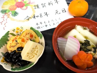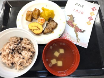 明けまして おめでとうございます!令和8年が始まりましたね (^_-)-☆栄養課一同 力を合わせて 今年も全力投球します!大晦日から年始にかけて 真心こめて料理しました皆さま 本年も健やかに お過ごし下さいますよう 心よりお祈りいたします 栄養課一同