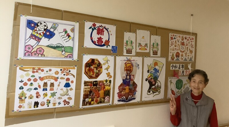 壁に貼るものも、ご自身の塗絵やお節料理の写真やこちらから渡した(PCの拾い画を印刷した)ものなど多岐にわたり、レイアウトも考えバランスも考え貼られているようです(*^-^*)