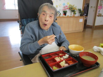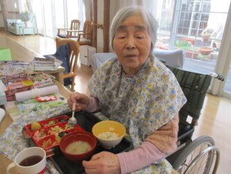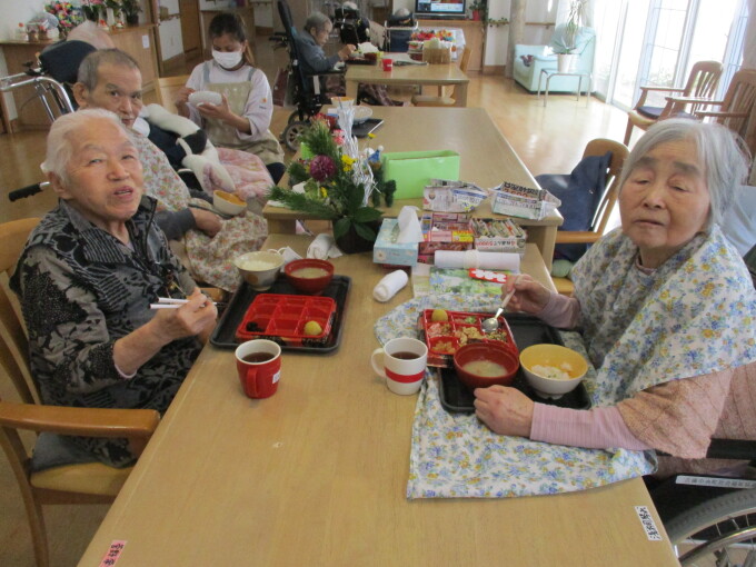 元日の昼食に色鮮やかなおせち料理をいただきました。重箱に並んだお料理を前に「全部食べれるかな」と驚かれる方もいらっしゃいましたが、お正月ならではの美味しさは格別。お隣の方と楽しくお話をしながら、皆様喜んでくださいました。