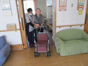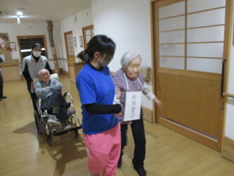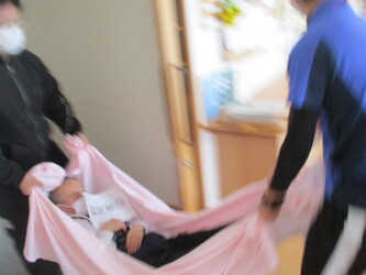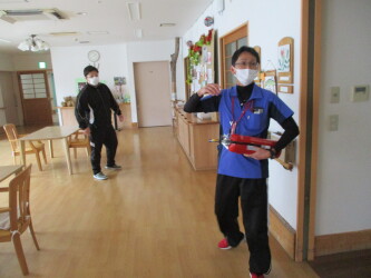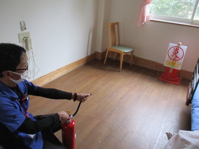 施設内で夜間に火災が発生したという想定で3/25に避難訓練を実施しました。 実際に非常ベルを鳴らして行いました。火点は居室のコンセント付近です。初期消火を行いますが、訓練なので消火は失敗想定です。職員が協力して入所者の皆さんを避難誘導しました。非常ベルの音が大きいので、職員同士声をかけ合いながら対応することが大事です。日々訓練を行いながら、いざというときに迅速に動けるように備えたいと思います。