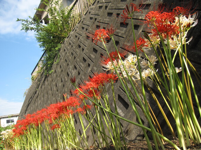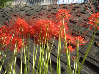 彼岸花が咲きました。「やっと咲いたでぇ。写真撮るんじゃろう。」園芸好きの入所者さんが教えてくださいました。長楽荘の裏庭の彼岸花。例年になく暑さ厳しい夏がやっと過ぎ・・・今、満開を迎えています。