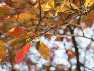 長楽荘のハナミズキの葉が色づいています。今日も夕日に照らされて美しく輝いています。
