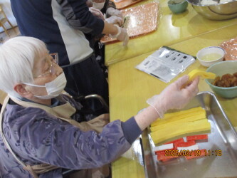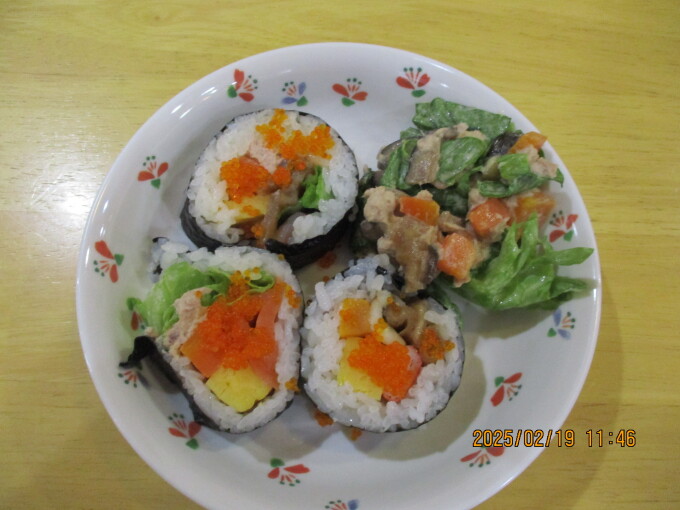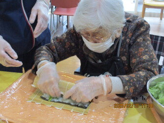 今回は皆さんが昔から好きな巻き寿司作りを行いました。「私も久しぶりに巻きたい」と真剣に巻かれていました。形が少し崩れた物もありましたがとても美味しく頂きました。