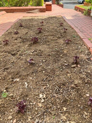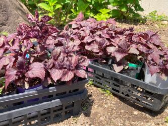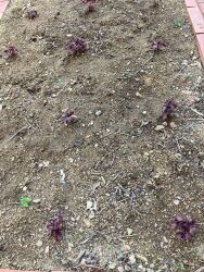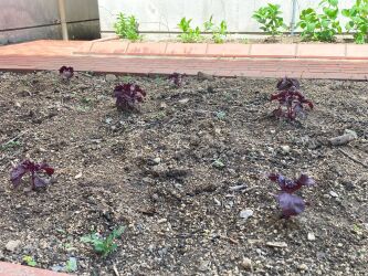 アミカルの畑に赤しそが芽を出し、沢山苗ができました。庭の花壇に赤しそを移植しました(*^^)v