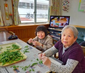 次々に アミカルの畑から新鮮野菜が届きます!今日は グループホームの皆さまのお手を借りて筋を取り除いて頂きました )^o^(昔されていたのか 手際の良いこと!前回は 天ぷらにしたので 今回は ・・・・・果たして どんな料理にしましょうか?乞うご期待ですね・・・ (#^.^#)