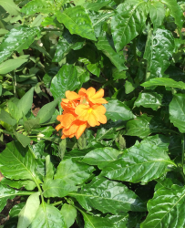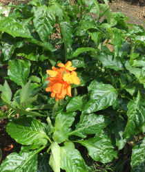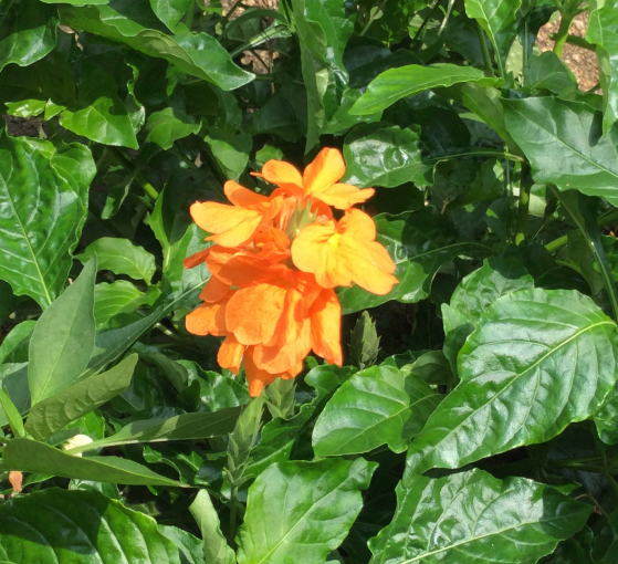 緑のツヤツヤピカピカ葉っぱに派手なオレンジの花Google先生によると「クロサンドラ(別名「サマーキャンドル」)です」とのこと確かにキャンドルに灯る炎のような風情原産地はインド・スリランカ・アフリカでこんなに夏の花っぽい葉と花ですが強い日差しには弱く、葉焼けをするそうです花も見かけによりませんね (^_-)-☆花言葉は「優美」「理想の美」「仲良し」