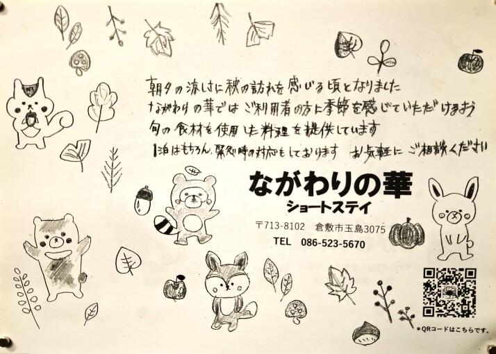 『ショートステイ 秋バージョンのちらし』 朝夕の涼しさに秋の訪れを感じる頃となりましたながわりの華では、ご利用者の方に季節を感じていただけますよう旬の食材を使用した料理を提供しています一泊はもちろん緊急時の対応もしております お気軽にご相談ください よろしくお願い申し上げます