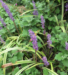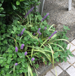 玄関スロープの脇他の植物に埋もれそうになりながら紫色の花が咲いていましたよく見ると小さな可愛い花の集合体で名前はGoogle先生によると「ヤブラン(リリオペ)」です」とのこと塊根は漢方や生薬(大葉麦門冬)として利用されることがあるそうです花言葉は「忍耐」「謙虚」「隠された心」