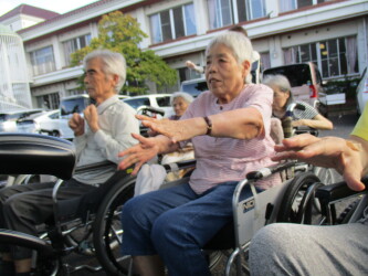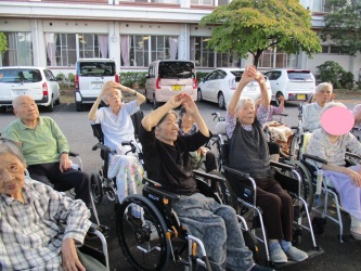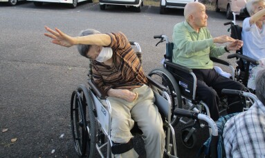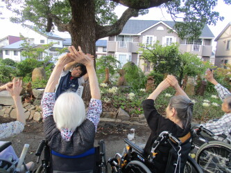 月曜日の午後に体操を行っているのですが、天気が良かったので外に出て行いました!(^^)!「わあ~ いい天気じゃな、寒いかと思ったけどちょうどいいわ」と嬉しそうな様子でした。体操が始まるとみなさんしっかり手や足を上げて体操をされています!!外でする体操は気持ちいいですね~