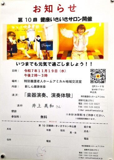『第10回 健康いきいきサロンのお知らせ』日時:令和7年11月19日(水)午後2時~3時場所:特別養護老人ホームアミカル地域交流室内容:新しん健康体操講演:「楽器演奏、演奏体験」 講師 井上 美和 さん 懇談参加料:無料いつまでも元気で過ごしましょう!!