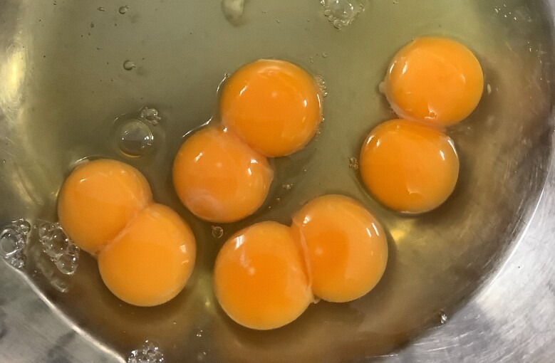 調理用に卵を割ってみますと、10個中6個が卵黄2個入りの双子卵でした。分かりにくいですが、大きい写真で見てください!(^^)!