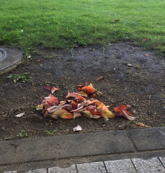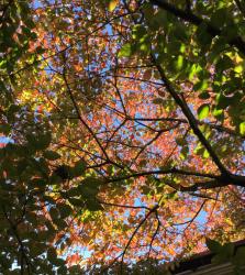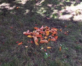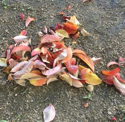 日に日に赤さを増す「ハナミズキ」晴れ渡った青空に良く映えます (^_^)v落ちた葉は入荘者の方が毎日掃き集め捨ててくださいます( ありがとうございます m(_ _)m )そんな集められた落ち葉も綺麗な秋色で上も下も秋真っ盛りです ヾ(≧▽≦)ノ