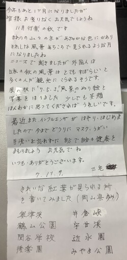 ある日「お部屋と廊下の写真を撮ってほしい」と三宅三恵子様が事務所に来られ、ホームページに載せるための文章もしたためて持参されました。目を通すと、季節の様子や日々感じていること、そして自分の健康のことなどなどが書かれており、とても温かい気持ちになりました(*'ω'*)