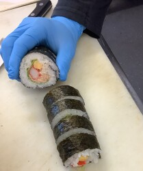 さて、調理場では巻き寿司を巻くための具材も用意し、よーいドンで巻きにかかります!(^^)!