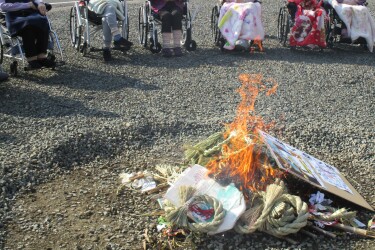 今年皆さんに書いていただいた書き初めやお飾りを燃やして