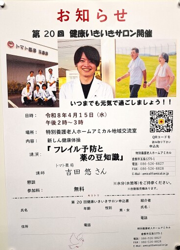 『第20回 健康いきいきサロンのお知らせ』日時:令和8年4月15日(水)午後2時~3時場所:特別養護老人ホームアミカル地域交流室内容:新しん健康体操講演:「フレイル予防と薬の豆知識」 講師 トマト薬局 吉田 悠 さん 懇談参加料:無料いつまでも元気で過ごしましょう!!