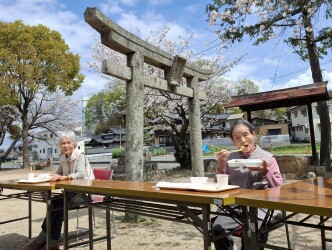 そのあとは希望者のみになりますが、お昼ごはんを弁当箱に詰め、すぐ近くの岩畔神社に出かけ外でランチとなりました(*'▽')