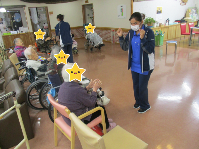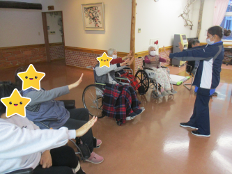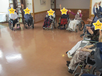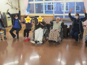 ~新館リハビリ担当職員より~コミュニティスペースに集まりみんな頑張って『新しん健康体操』をしました!!